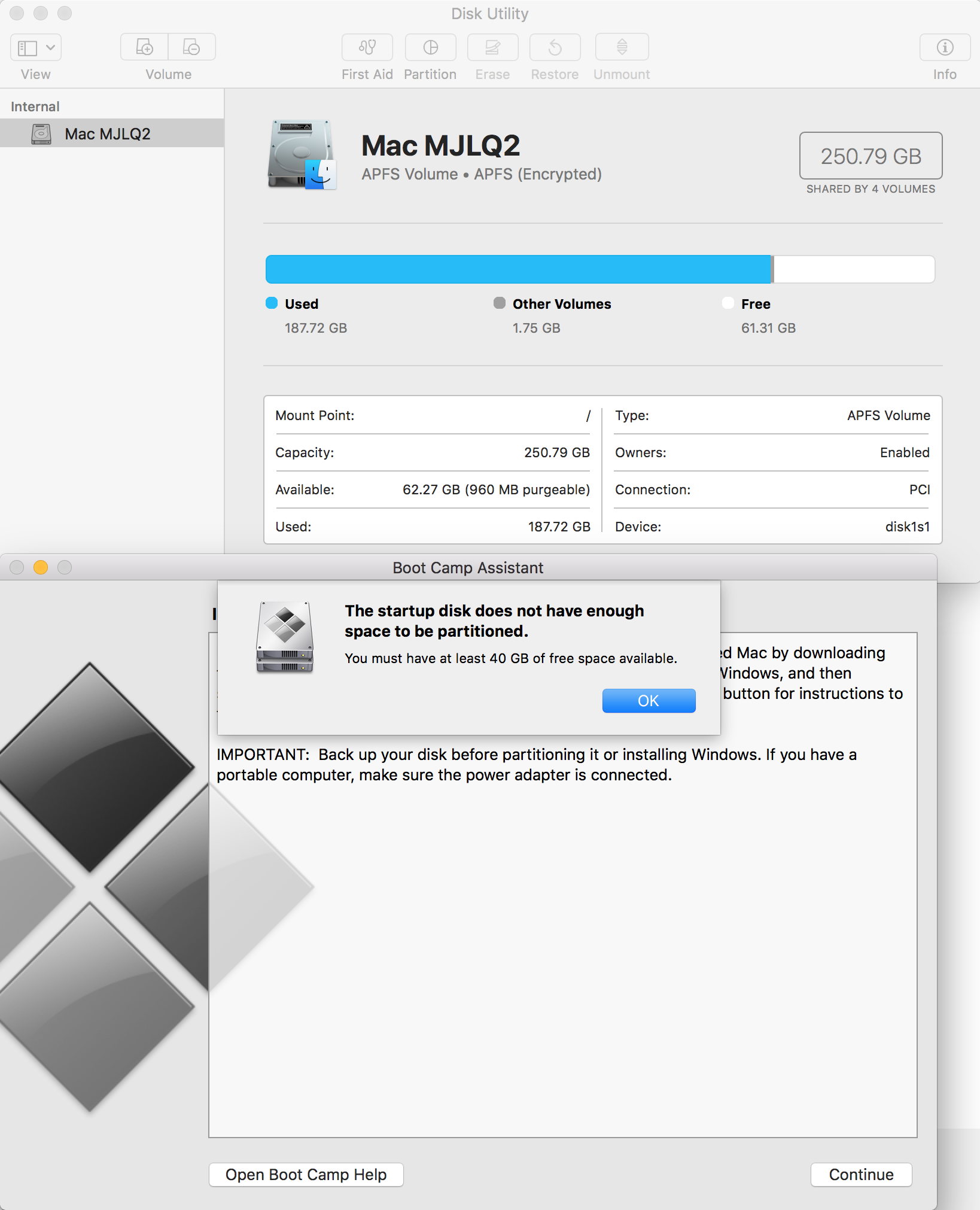 I am trying to install W7 but BCA reports there is not enough space on my drive. I have tried First Aid and restarted to no avail. The Erase option is blanked out. When trying to add a partition it says there is only 18GB available which is untitled.