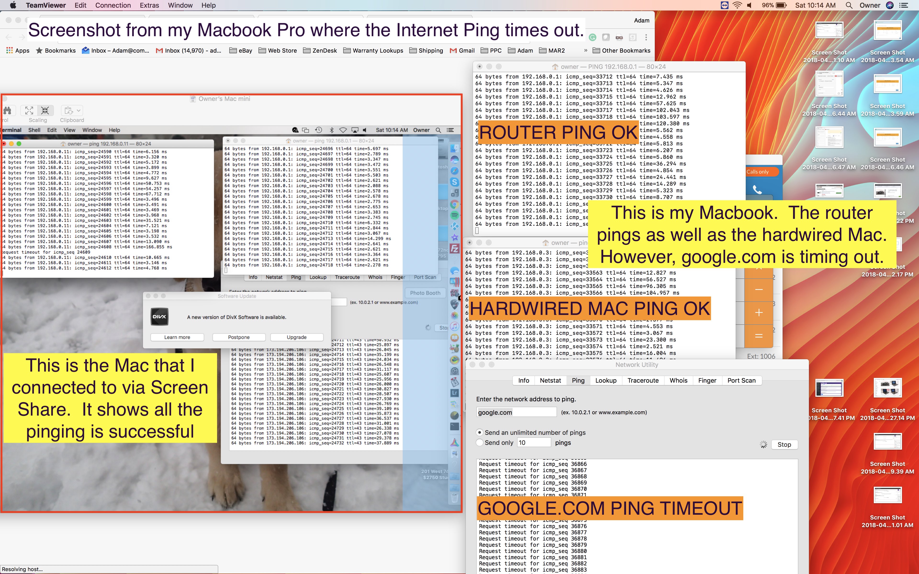 Also, when the internet ping stops working I did a screen share to the hardwired Mac. On that system, I have the same pinging to Google.com running and there the ping it still successfully pinging. It seems that it isn’t an issue with the ISP but rather something specific to my MacBook. I’ve gone through every setting in the router be regardless of the settings the same issue persists. I even had Time Warner completely replace the router but sure enough, the same issue persists.