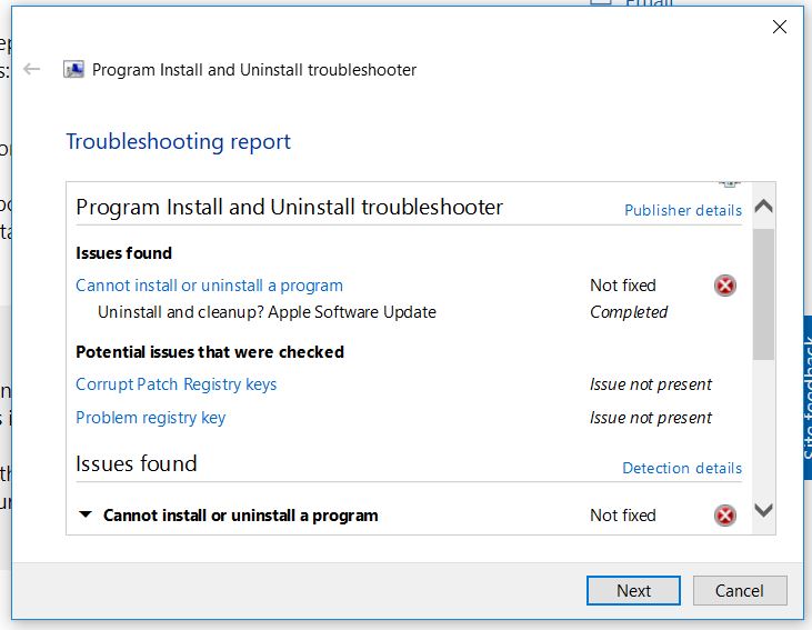 Even though I have seemingly uninstalled everything Apple as they're no longer listed in the Uninstall Programs list, when I run the Microsoft Program Install and Uninstall Utility, it still sees Apple Software Update, Apple Mobile Device Support, Apple Application Support 32- and 64-bit, and Bonjour - but it does not list iTunes or iCloud. Only the component apps refuse to die.