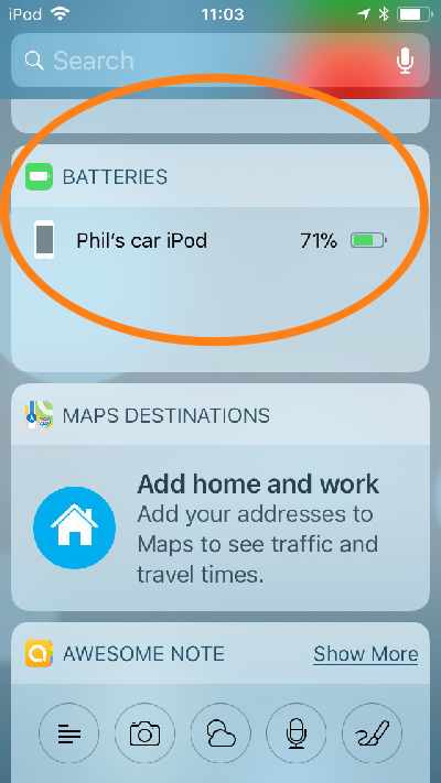 JLab BT Headphones - Battery widget pops up in the "Add More Widgets" section with percentage for both the iPod Touch and the headphones.