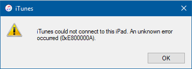 When I connect my iPad it asks me on the iPad to trust the computer, so I click on Trust and enter my PIN. When I start iTunes it asks me if I want to access content on the device. If I click on Continue, I get this error message: