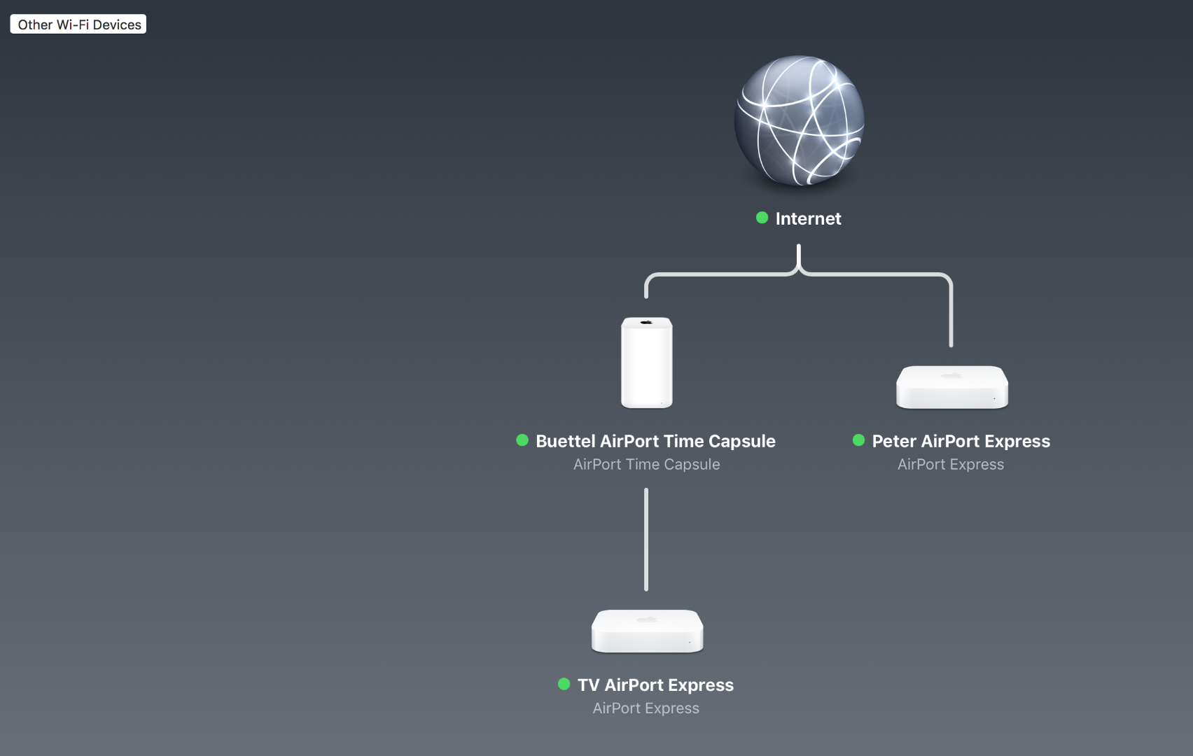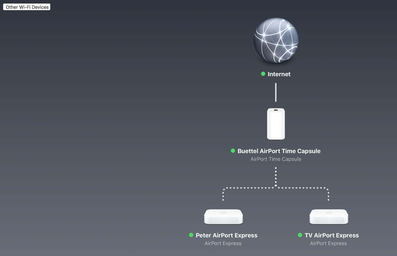 I will provide two screenshots that come up in my Airport Utility page. No 1 is obviously wrong and comes up sometimes. No 2 is what is there now. There is another configuration that I see normally but cannot get to show at the moment with TV AirPort Express in series and after Peter Airport Express connected by a dotted line. Otherthings that may be significant and do not show on the diagram is I have hard wired my Apple TV Box to the TV Airport Express because I thought it might be a good idea because my Apple TV was dropping out occasionally. I also have a SONOS Bridge feeding a SONOS Music system around the house wired direct to my Time Capsule. Maybe incidentally the SONOS System never givesme any trouble.