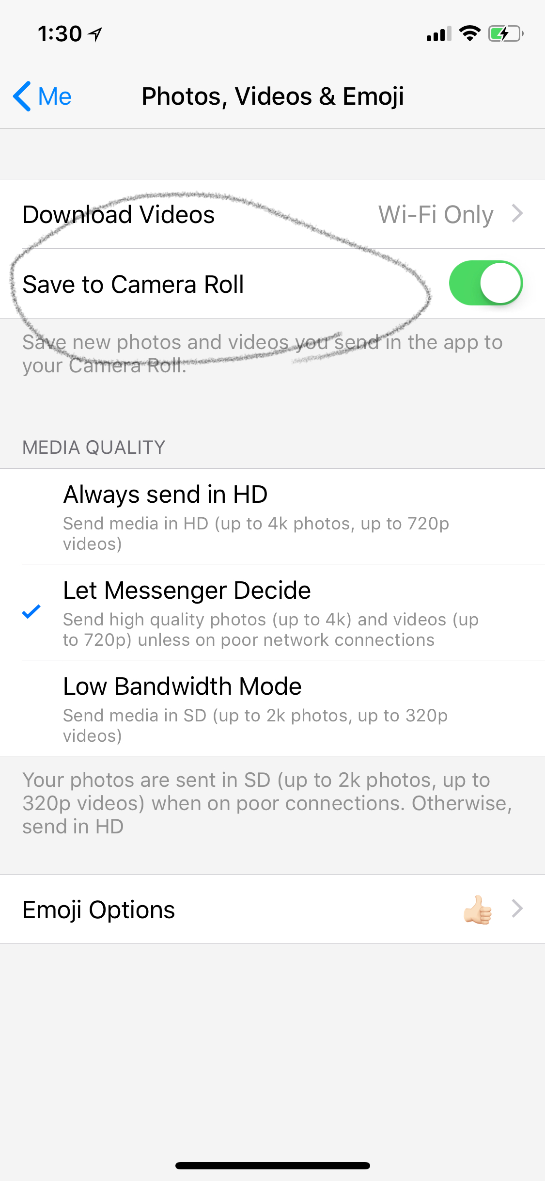 because i try on messenger many times it is not coming even when i enable save camera roll it is not saving automatic i have to save each photo by myself any one knows how to do it auto