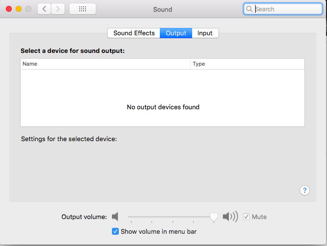 Also, when checked in the system preferences. It shows No Output Devices Found.