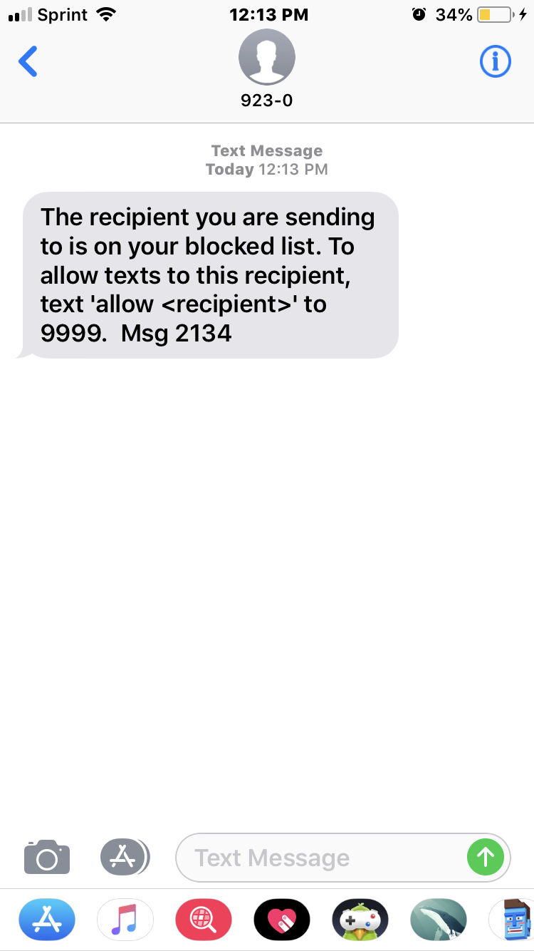 What do I do if I see “The recipient you are sending to is on your blocked list. To allow texts to this recipient, text 'allow ' to 9999. Msg 2134” in messages