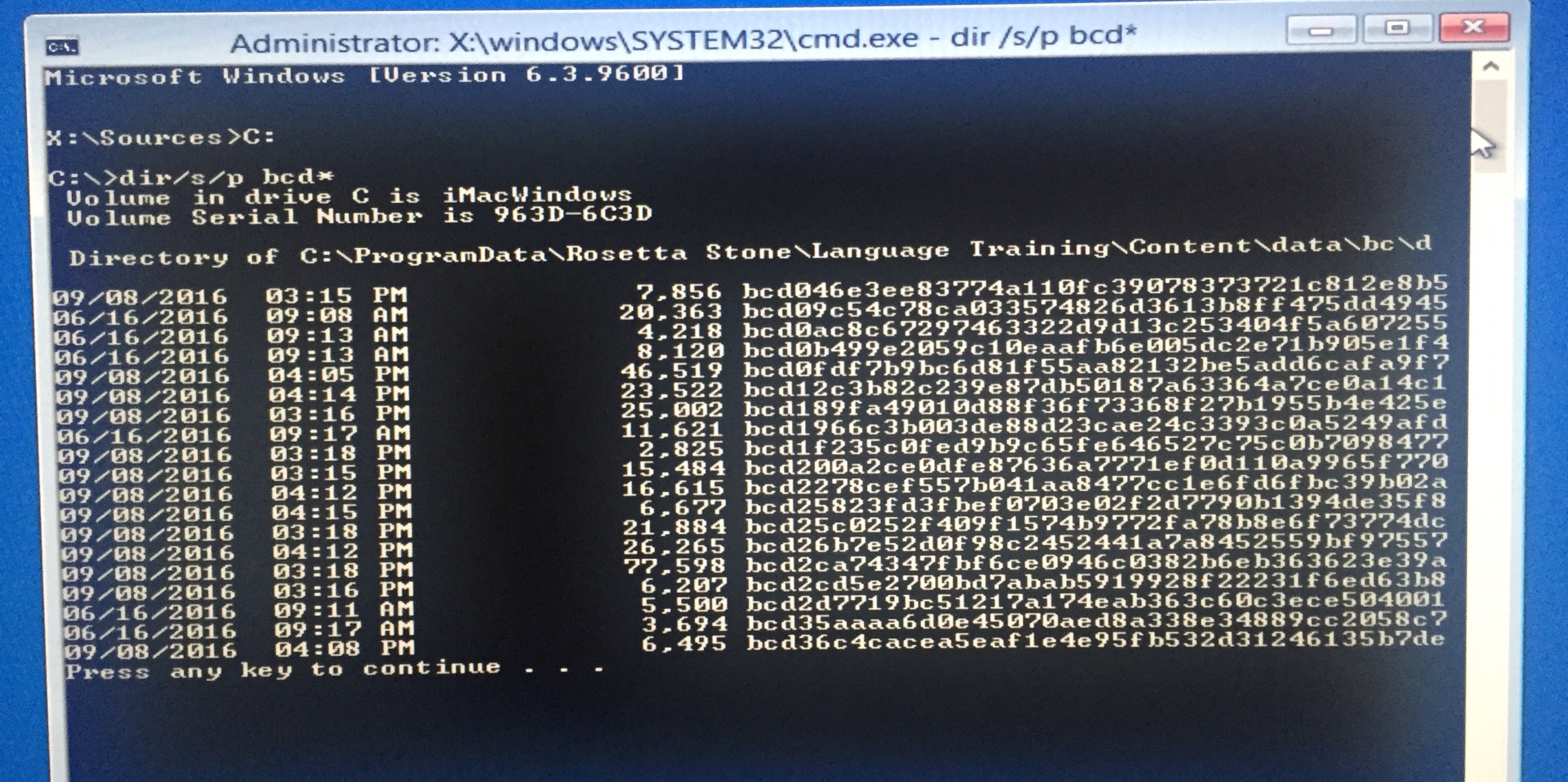 • I scanned the Bootcamp partition drive from within the Mac partition. It reported there is one infected file in the ProgramData/Rosetta Stone folder. I can locate this file with the Finder but I can't delete it even with the Terminal. Apparently I do not have the Write permission. I do have Paragon NTFS but apparently it can't even detect the drive right now so I can't use it to access the Permissions.