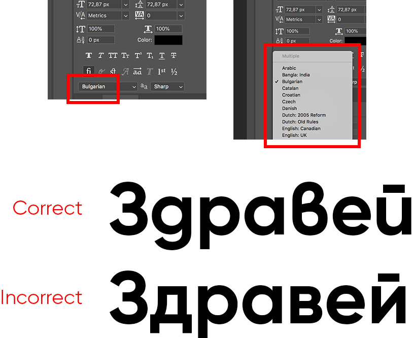 On Photoshop, you can easily change the language of the font (if the font allows it) to match the character specifications for that language. Here's and example with Bulgarian Cyrillic: