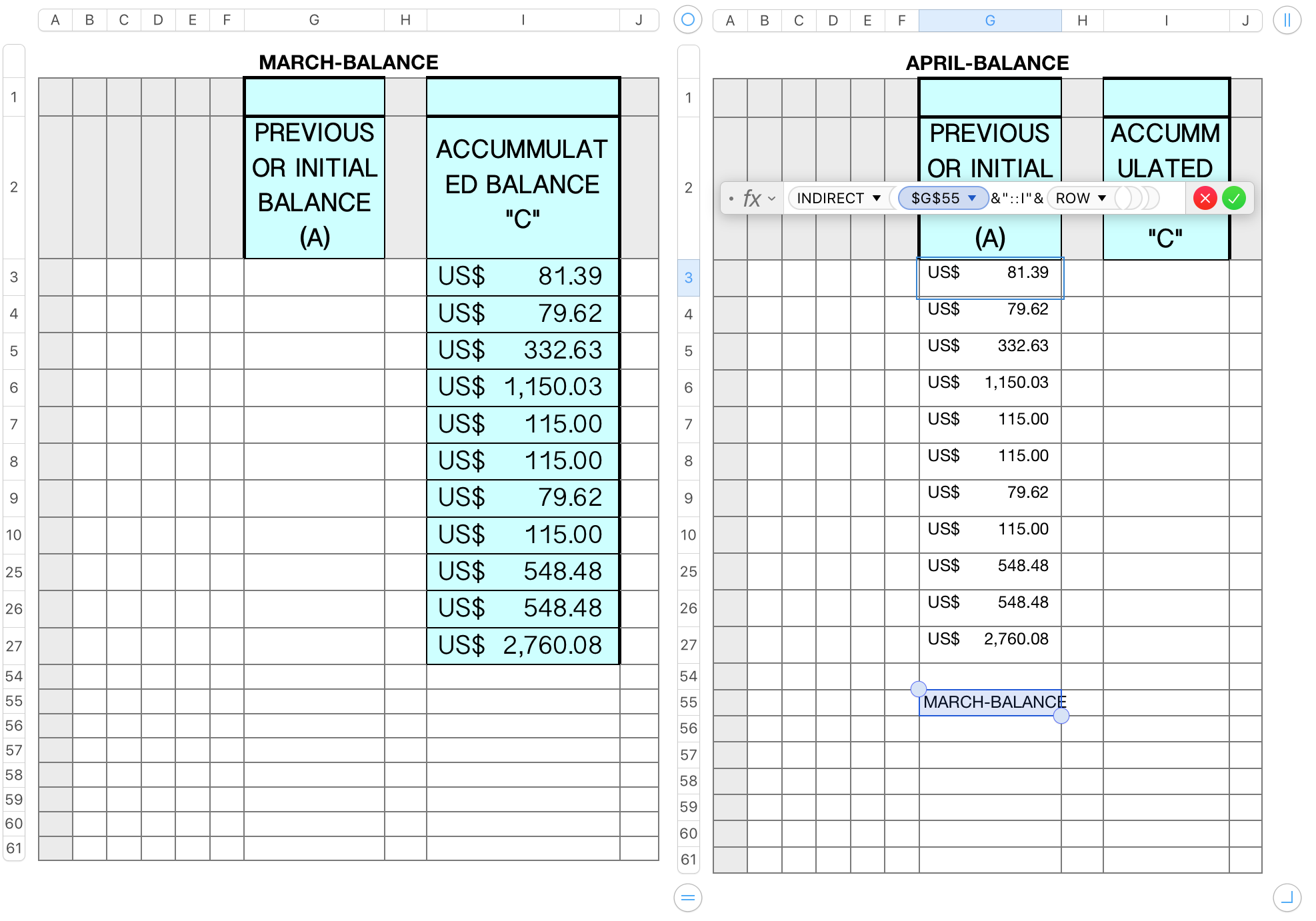 The cell $B$54 = MARCH-BALANCE -- This is the table name in the sheet of March (or April or the next month as the sheet progresses it will change at the $B$54 change the month and so the INDIRECT cell "I __" )"