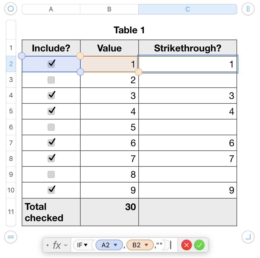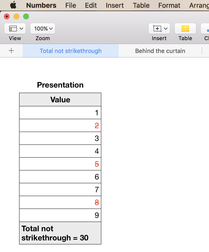 Exclude strikethrough cells in a Sum in Numbers