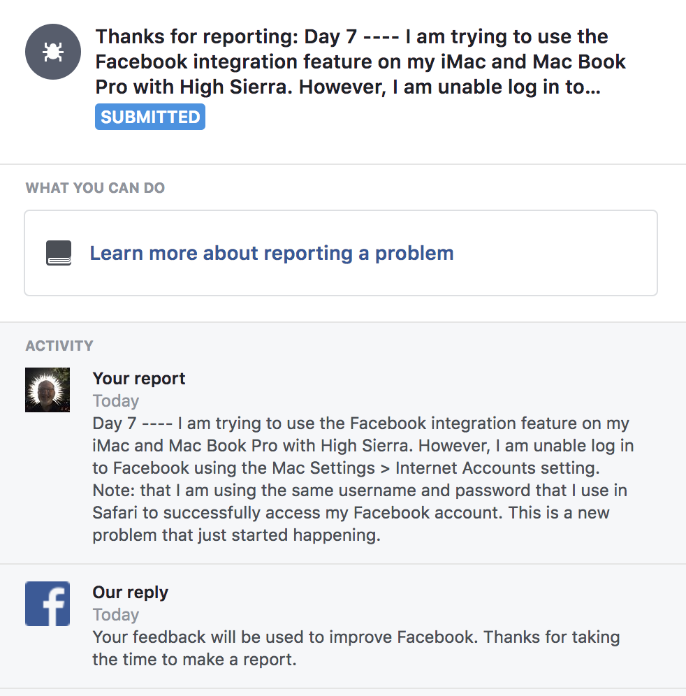 After changing my Facebook password, I keep getting a notification from the system (NOT the browser) "Facebook Password Required: Enter your password in Internet Accounts." In System Preferences -> Internet Accounts, clicking on Facebook gives me the message "Can't connect to the account Facebook. Enter the password for user [MY NAME]" When I put the password in, it says "Unable to verify account name or password."