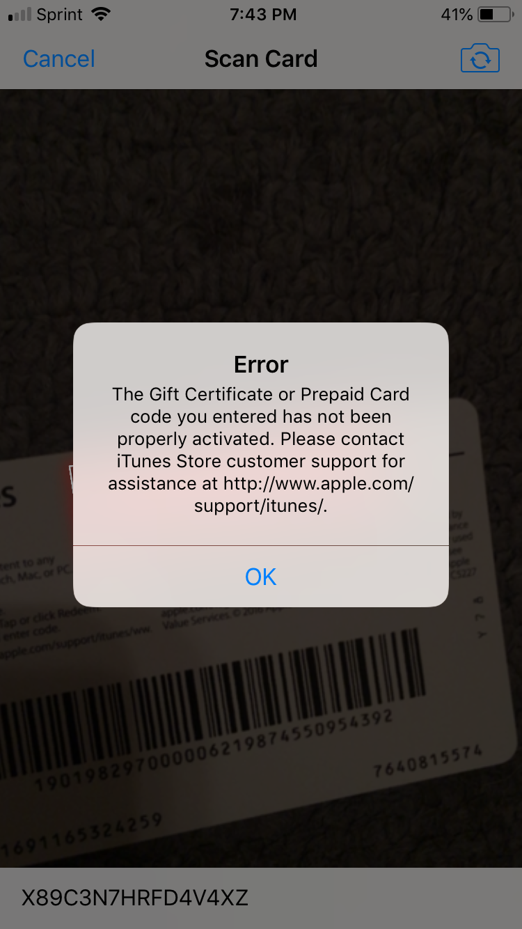 This apple gift card I got won’t register and says it hasn’t been properly activated