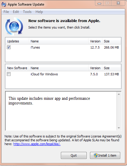 However today, the Apple Software Update offered iTunes 12.7.5 and iCloud for windows 7.5.0. but the same thing happens, it just fails each time. If i go into iTunes and select check for update it just kicks off the Apple Software Update and it does the same thing. i.e. " 'files shared by these update' has an invalid signature. The download has been removed."