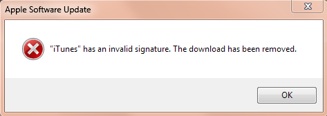 Over the past few weeks, the Apple Software Update has been popping up offering to install iTunes version 12.7.4. but when i try to install it, it fails. I then try to download the files first and it says it has an invalid signature. I have not been too concerned because I have already got iTunes 12.7.4. so it shouldn't be offering it to me in the first place.