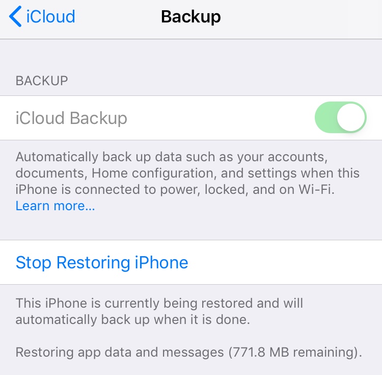 - When it finishes, you will go through the normal setup screens as if it were a new iPhone out of the box. Go through this process as normal; and when the time comes, select to restore from a previous iCloud backup. Select your most recent backup.