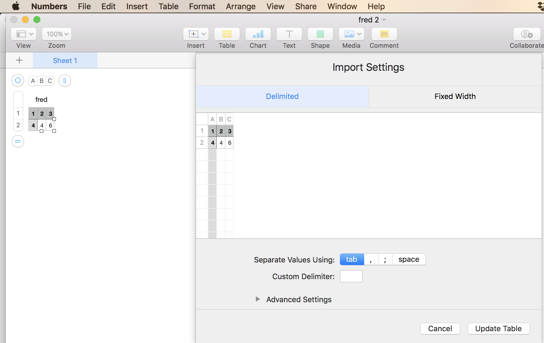 Question: Where is the adjust import setting Tab in the side bar in numbers
