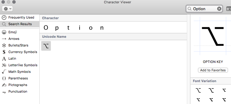 Select the Edit menu : Emoji & Symbols (^⌘Space). From the Characters panel, click the gear icon in the upper-left corner, and choose Customize List… . Select Technical Symbols. Now, all of the Apple keyboard shortcut symbols will appear on one panel when you select this category.