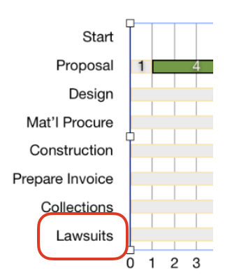 The x axis (value axis) is set to use as many steps as there are weeks in the project (plus enough to make a round number, and provide space for delays).