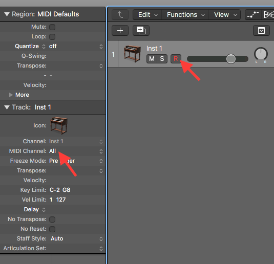 I'm having some issues with midi in Logic Pro X. I have one session that for whatever reason won't play anything when I physically try to play notes via my Axiom midi controller or even when I try to use the "Type to Play" Keyboard feature in Logic.