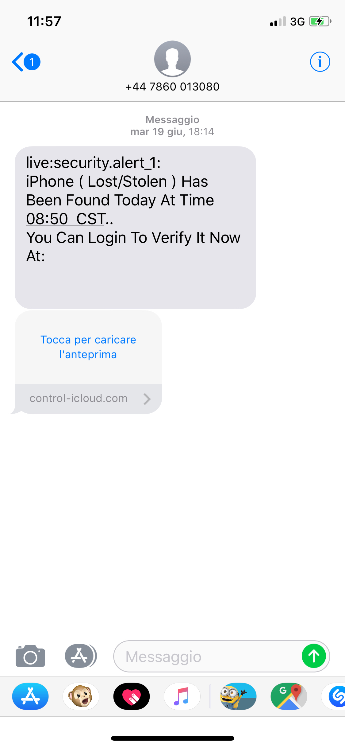Today I received a new message with the same content, but from Apple. I can't see the number, but it's associated with an old Apple name I have in my addressbook.