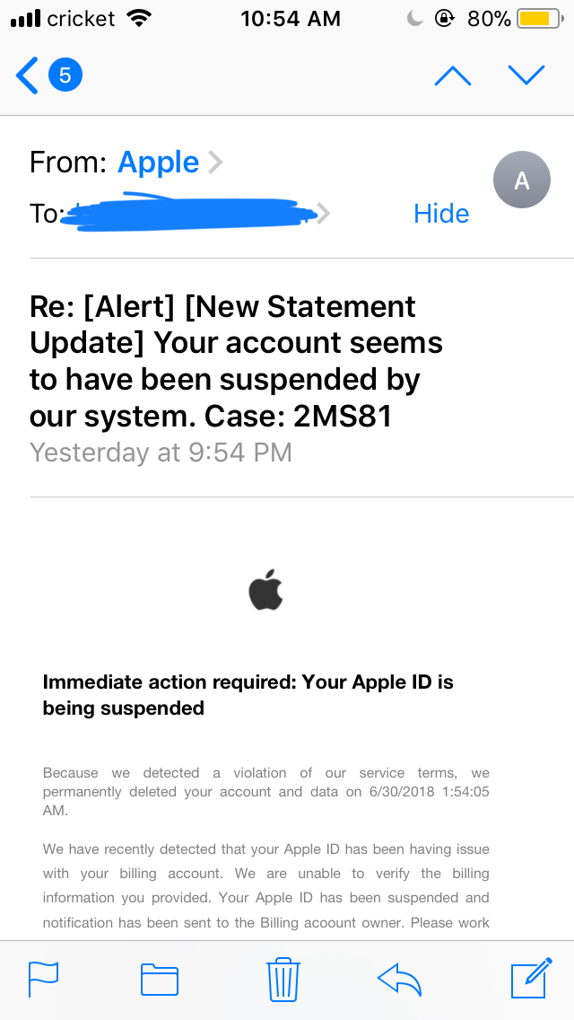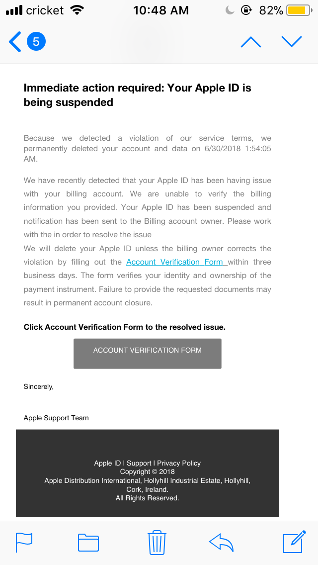 I received an email this morning stating my ID has been suspended and will be deleted in three days if I do not take action. It also says it is a reply, but I have not contacted Apple with any issues. I just wanted to know if someone could verify it as a scam for me, though I am fairly certain it is. One link takes me to mobigraphy.net and the other the Google homepage. But, it does look very official. I will give them that.
