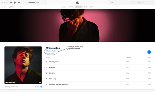 And "Up Next" is not repopulated with the tracks. If I copy the link under "Share" and put it in Safari, I get a web page with all the tracks (and they are clickable and play from within Safari, although off of the actual album the song comes from) but when I click "Listen in Apple Music", I end up with the same page without tracks. So still not a workaround for me.