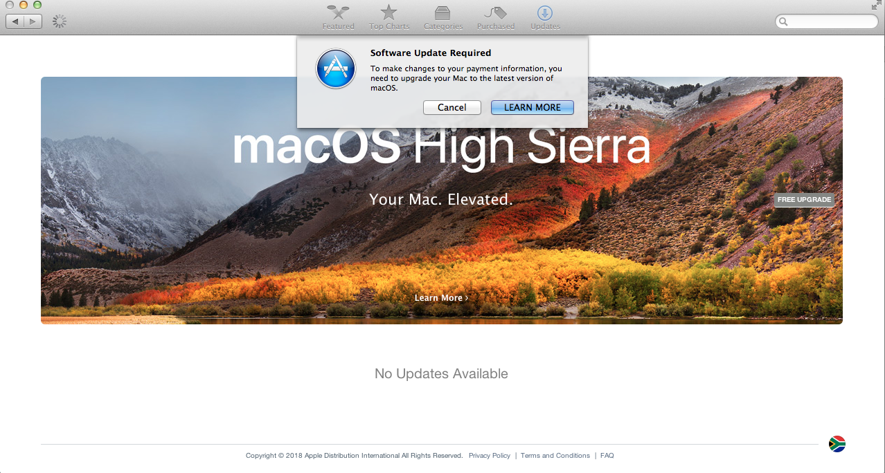 I inherited it from someone else so clearing it seemed like the logical thing to do. However, I can't upgrade the software. I know that an update is needed but when I go to the App Store, there are No Updates Available. However, I can see the upgrade to HighSierra banner in the background. After clicking the 'Free Upgrade' button, this dialog box appears.