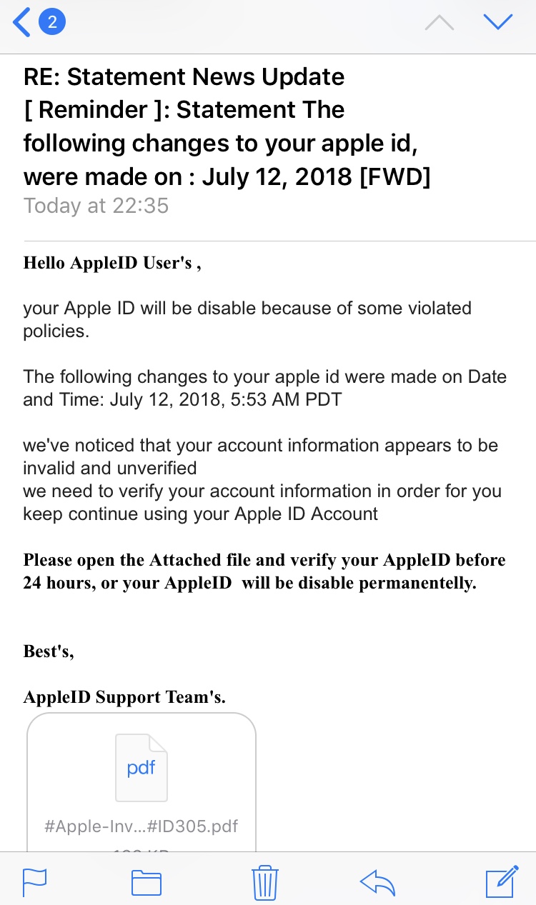 Every once in a while I get a random email about my Apple account that’s clearly not from Apple. It always says something about my account being closed or that I have violated terms trying to get me to open a document or link. Of course I don’t as the email is definiely not an Apple email. How do I get these emails to stop???