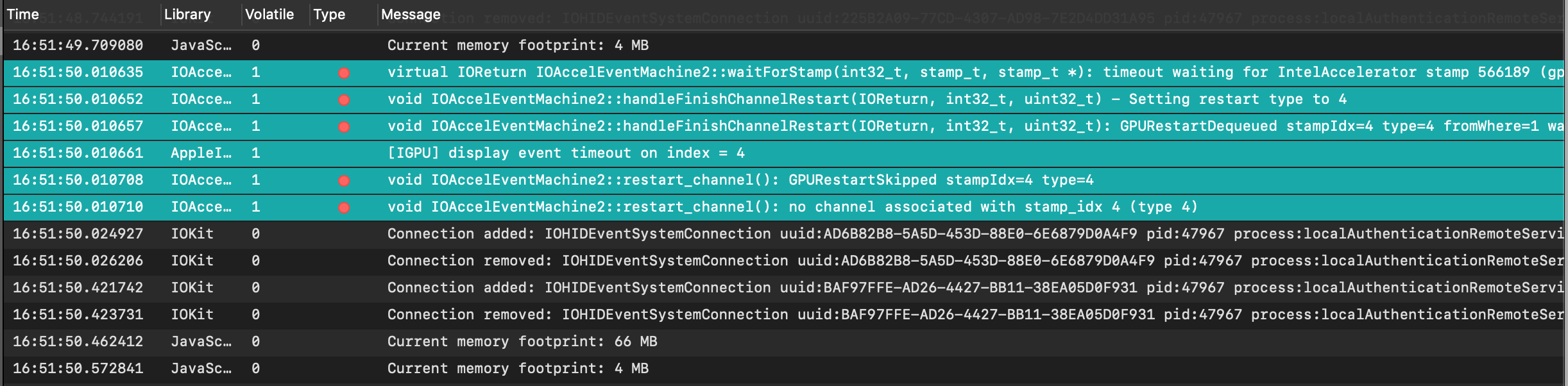 fault	20:46:06.485367 -0700	kernel	void IOAccelEventMachine2::restart_channel(): no channel associated with stamp_idx 4 (type 4)