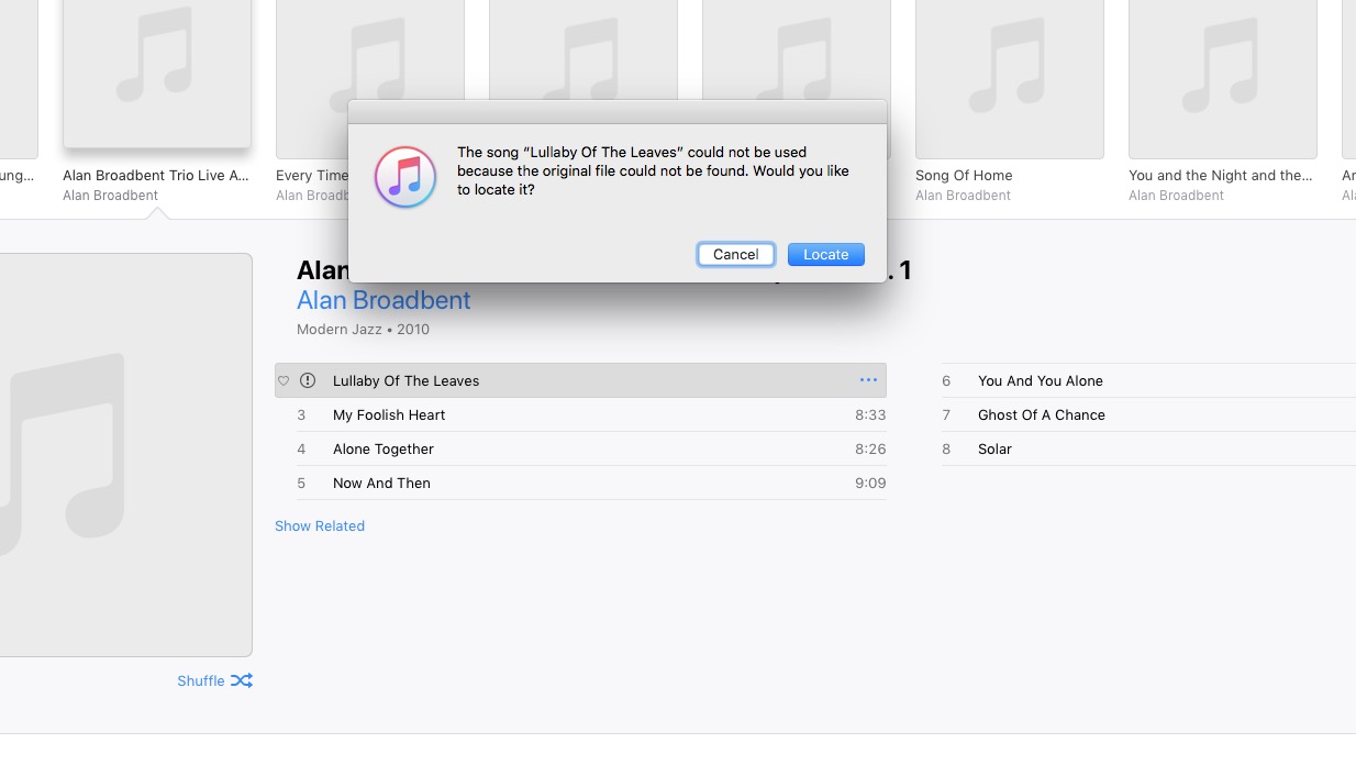When I try to open a track a ! appears beside the name indicating the original info for the tracks can't be located.
