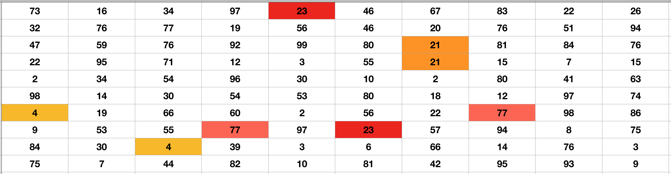 Your to 10 x 10 table will now have random values, with no duplicates: