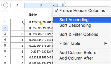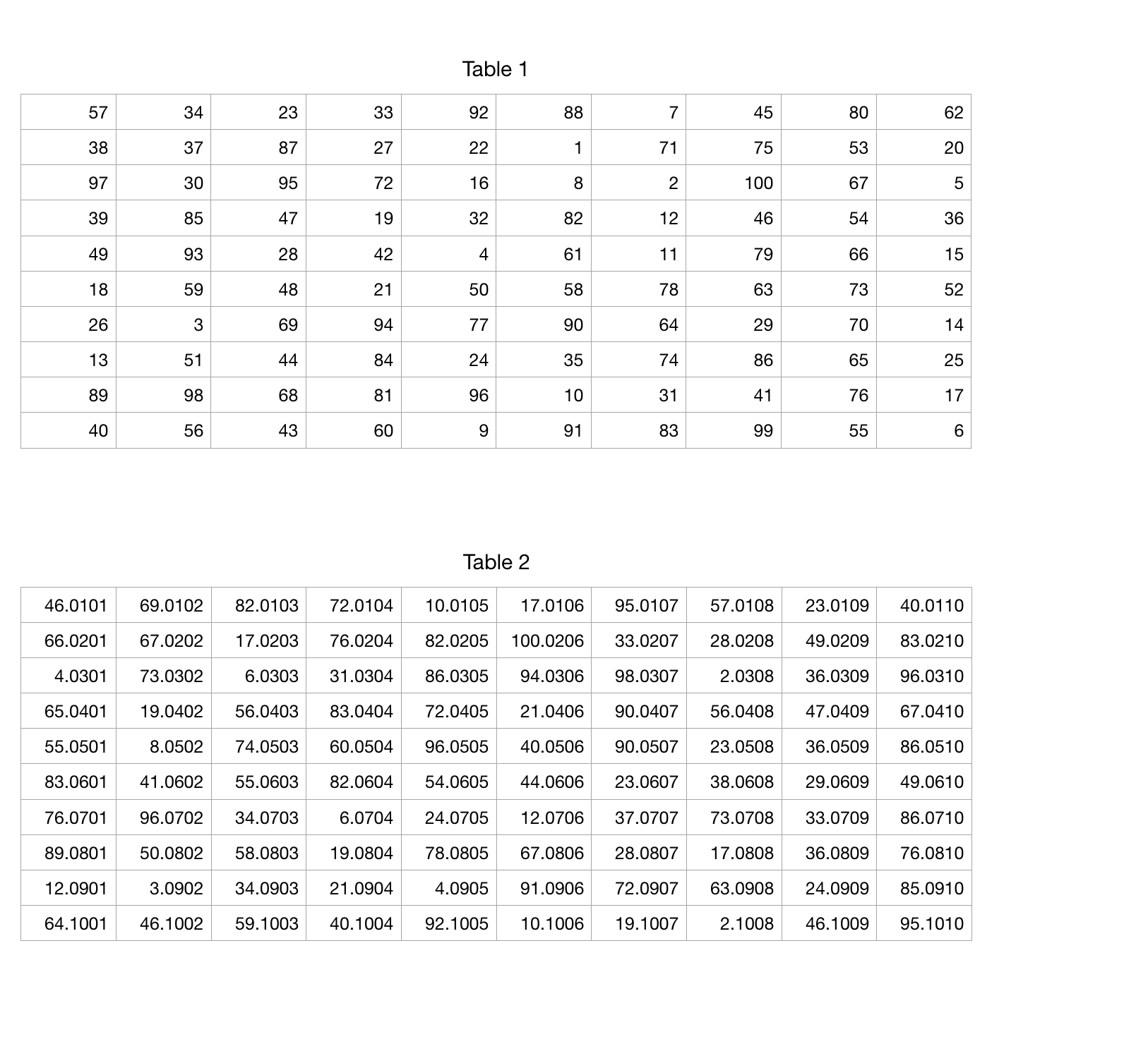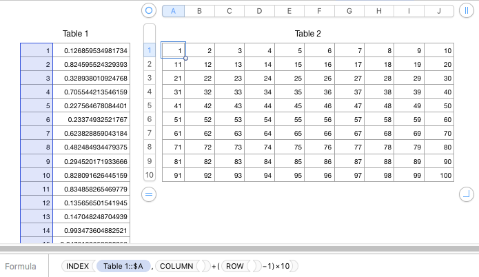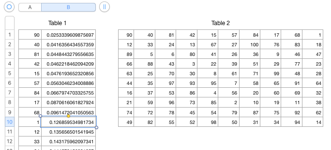 All cells of Table 2 have the formula =RANDBETWEEN(1,100)+ROW()÷100+COLUMN()÷10000