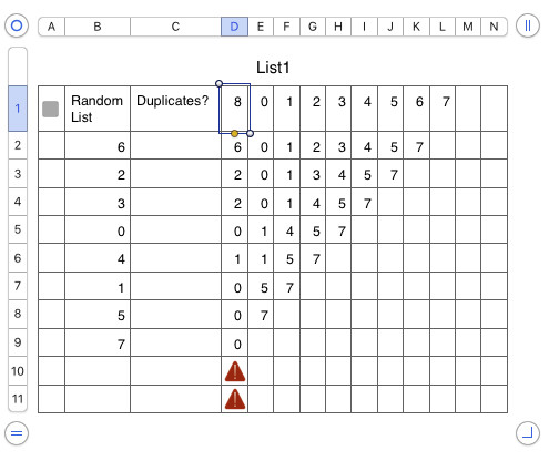 Not carefully enough I have to admit. I retract my statement that methods for removing duplicates will skew the randomness. It appears yours will retain the full randomness. It does have some drawbacks (it is limited by the max number of columns in Numbers and it requires roughly N*N/2 IF statements) but it is clever and does the job.