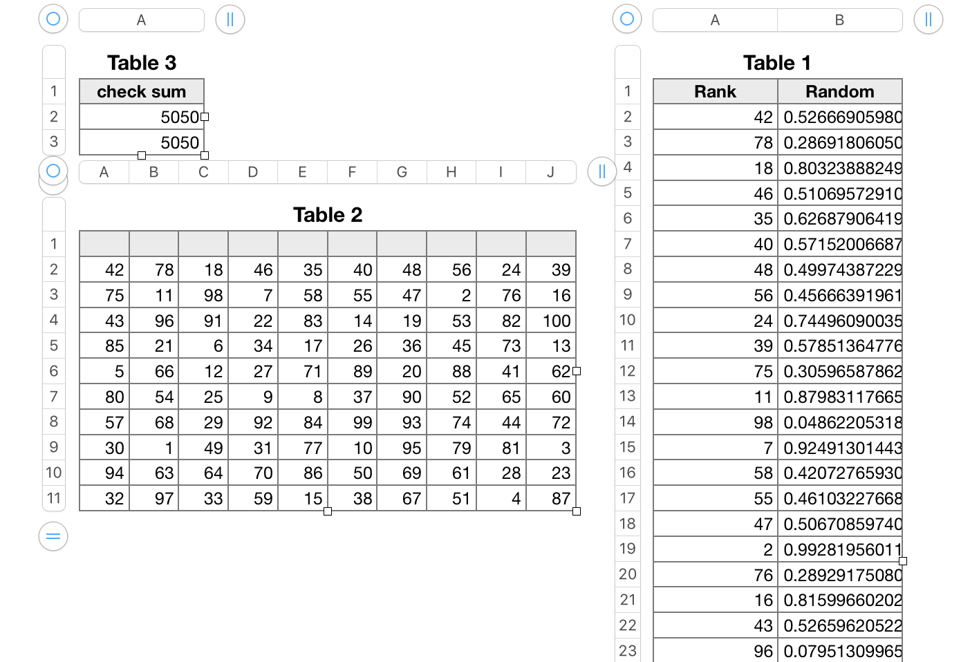 Table 3 (optional) calculates a check sum. If no numbers are duplicated in the list (or in Table 2) The check sum will be 5050, the sum of all the integers from 1 to 100. If there are duplicates, that sum will be less than 5050.
