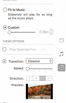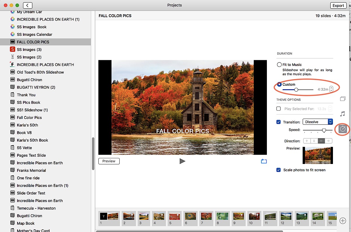Thanks for answering my question. It sounds so simple but I am unable to locate the "duration button" or "transition button" in my Photos collection. Can you give me a tip on where to look? Thanks again.