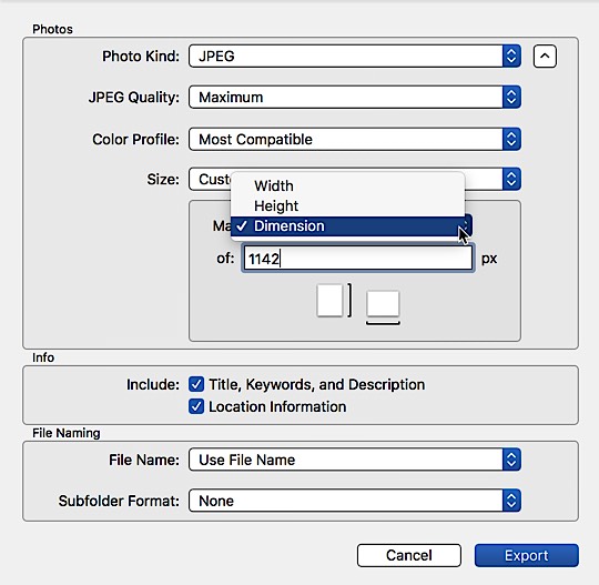 3 - export the photos to a folder on the Desktop with a custom size: set the maximum size to the the maximum size of the frame's screen.