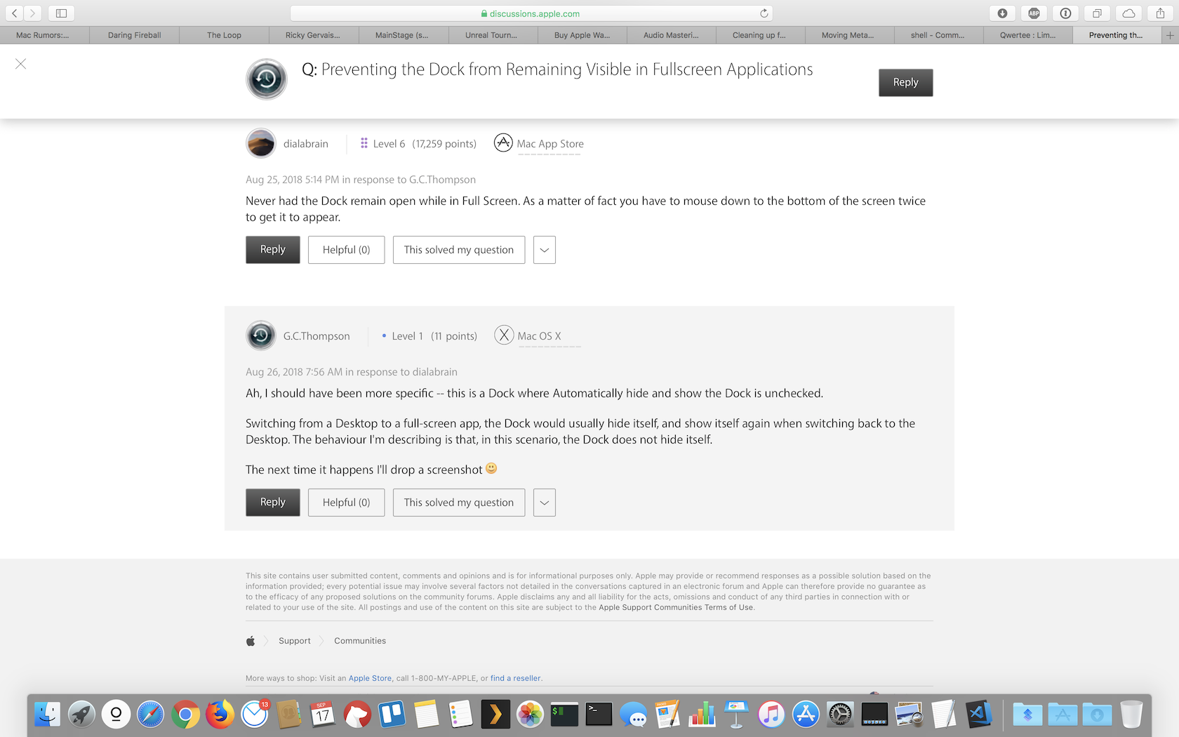 I wasn't saying you were faking. What I am saying is if your Dock is not showing/hiding while in Full Screen your Mac in particular is not behaving correctly. You shouldn't need a workaround, it should be fixed. See if it does the same thing while in Safe Mode or if you log in to a new user account.