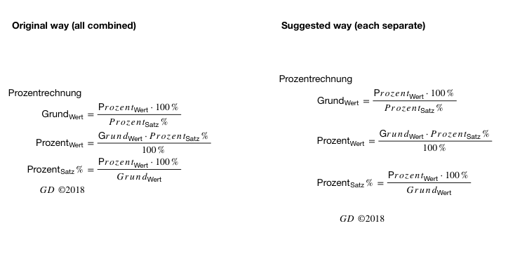\ \\ \text {Grund}_\text{Wert} \thinspace &= \frac { \text Prozent_\text{Wert} \cdot 100 \% } { Prozent_\text{Satz} \% } \\