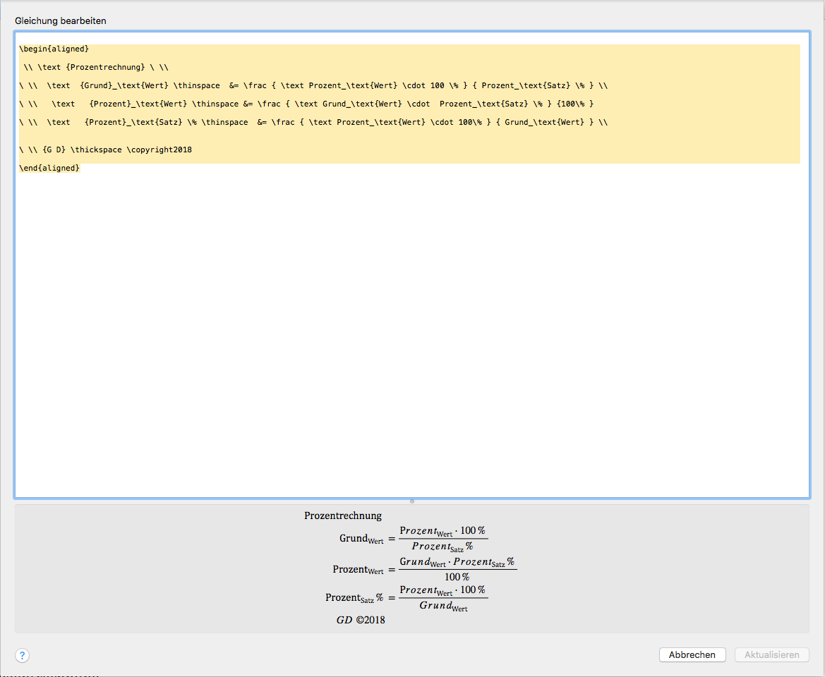 \ \\ \text {Prozent}_\text{Wert} \thinspace &= \frac { \text Grund_\text{Wert} \cdot Prozent_\text{Satz} \% } {100\% }