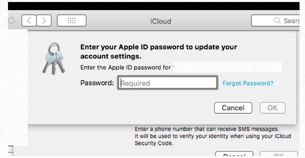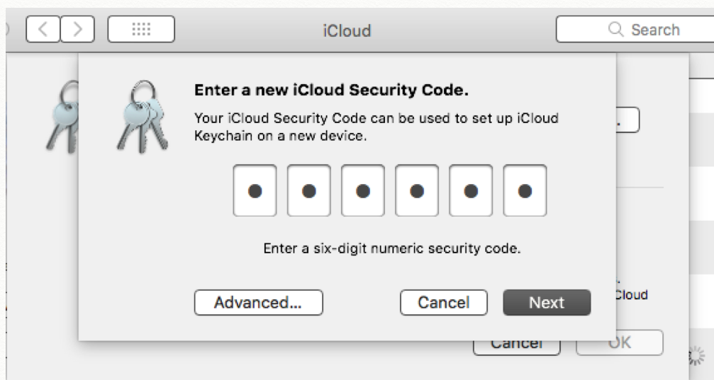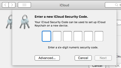 I open system preferences > iCloud > the box for keychain is checked > click on options > allow approving with security code is checked click on change security code , do not enter the six digit code .