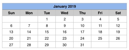Here is January 2019. Type 1 into the cell for 1st January (Cell B2).