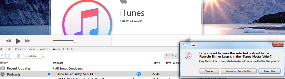 I upgraded to iTunes for Windows 12.9.0.167 and now the podcast delete functionality is misbehaving. It used to be that you could right-click on a podcast episode and select "Delete from Library". This would delete the local file and remove it from the UI, so that the only ones visible were the ones you had curated to keep around.