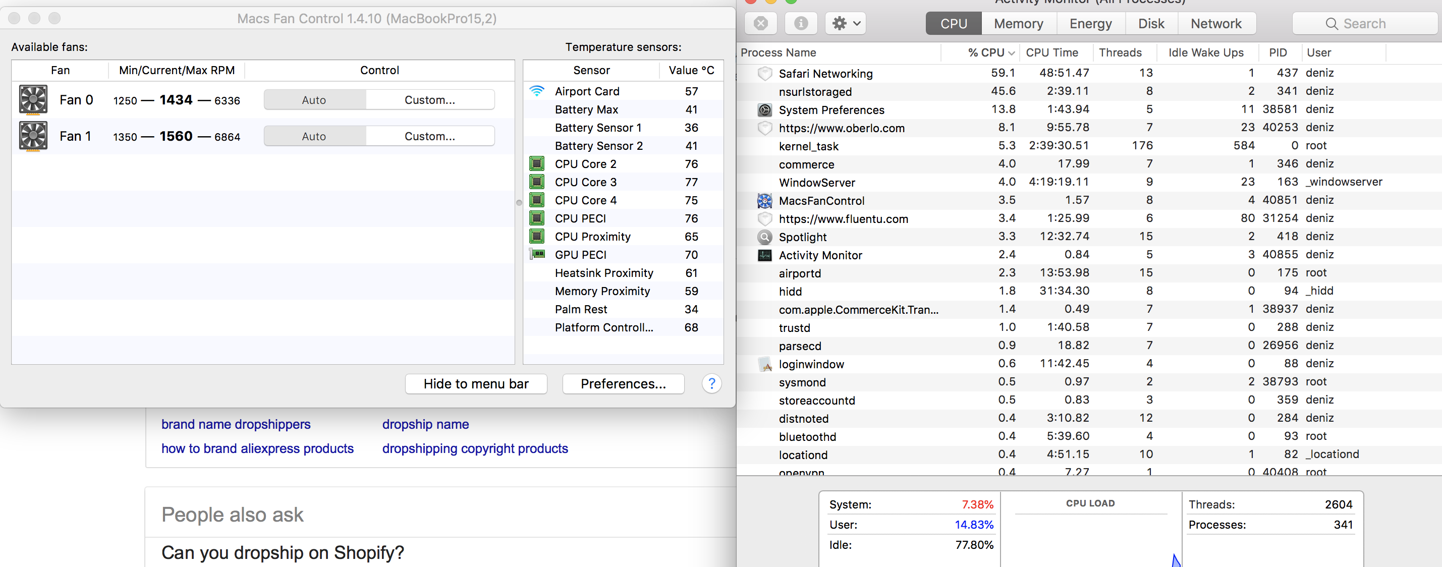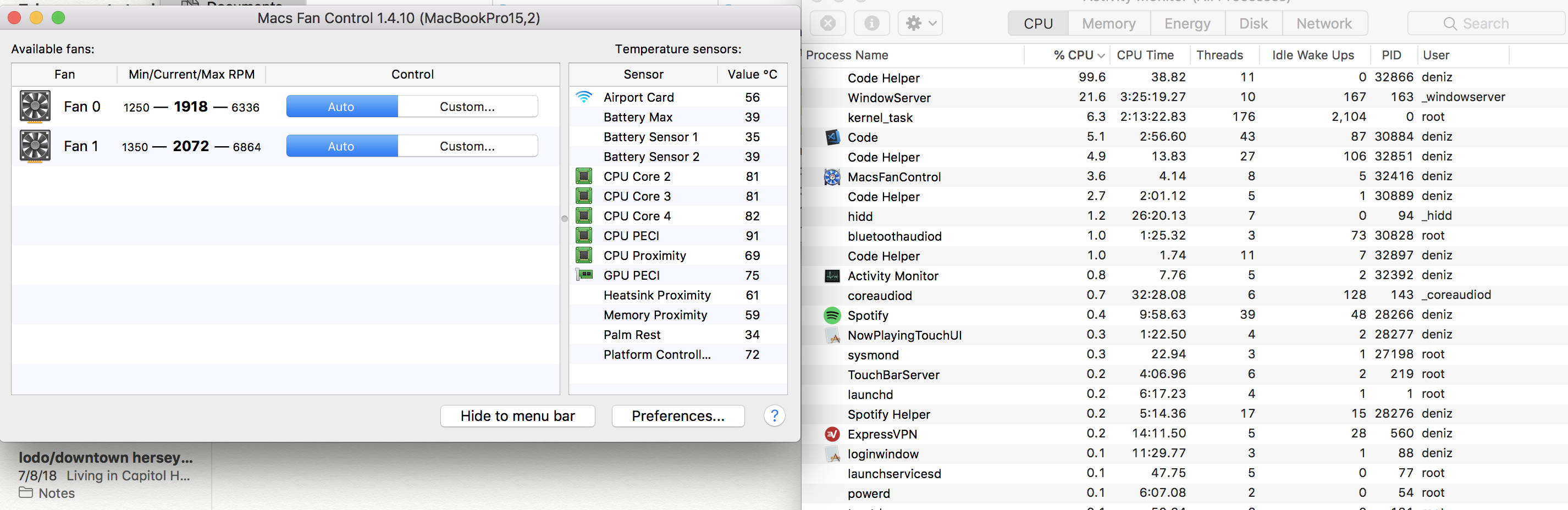 So the biggest issue with this computer is that even under very light load, it overheats. Like the palm rests become uncomfortable because they are too hot, and don't even get me started how it feels if I use it on my lap. I literally have to wipe the computer every 10 minutes because of the sweat caused by hot palm rests. I got the same issue with the first Macbook Pro 2018 I bought, I then got it replaced, but there is no difference at all. Before touching on every issue, let me show you some proof that this computer's cooling system is not working properly. Writing this post, I am very uncomfortable because of the heat on my legs.