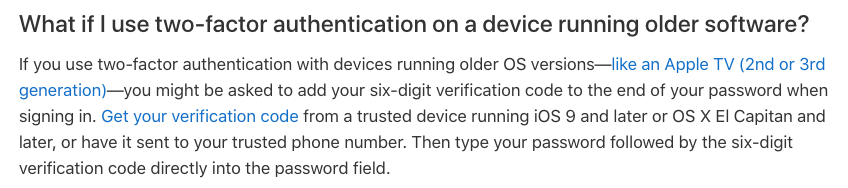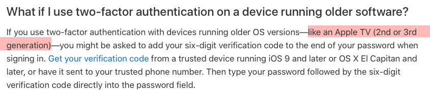 Try to sign in to an Apple TV version 2 or 3. Impossible!!!! 2FA *****!!!
