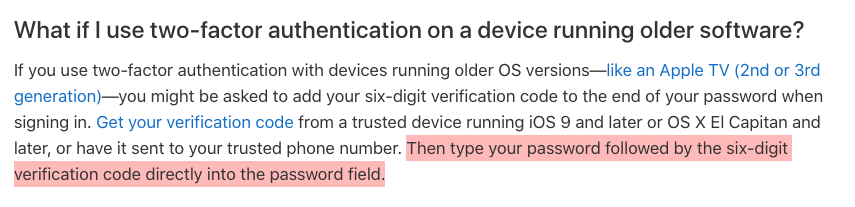 is there a workaround for older devices? I'm trying to sign in to my apple tv which was in storage for a year or two; I've updated the software, it recognizes my appleID and password still as valid, then just asks again for my password instead of asking for the 2-factor code