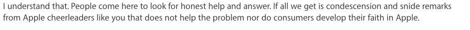 company. You’re not alone it seems to be a very common attitude among volunteers with your level of experience here. Maybe you all could consider a blog or website where you are not bothered by such posts or inquires .Please note, I am referring to people that are actually seem to be struggling with features rather than the complaints or anti Apple tirades. Those I’m sure continue to be frustrating but that’s not something that a volunteer needs to express their frustration . Veiled or not.
