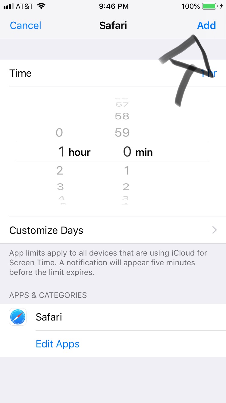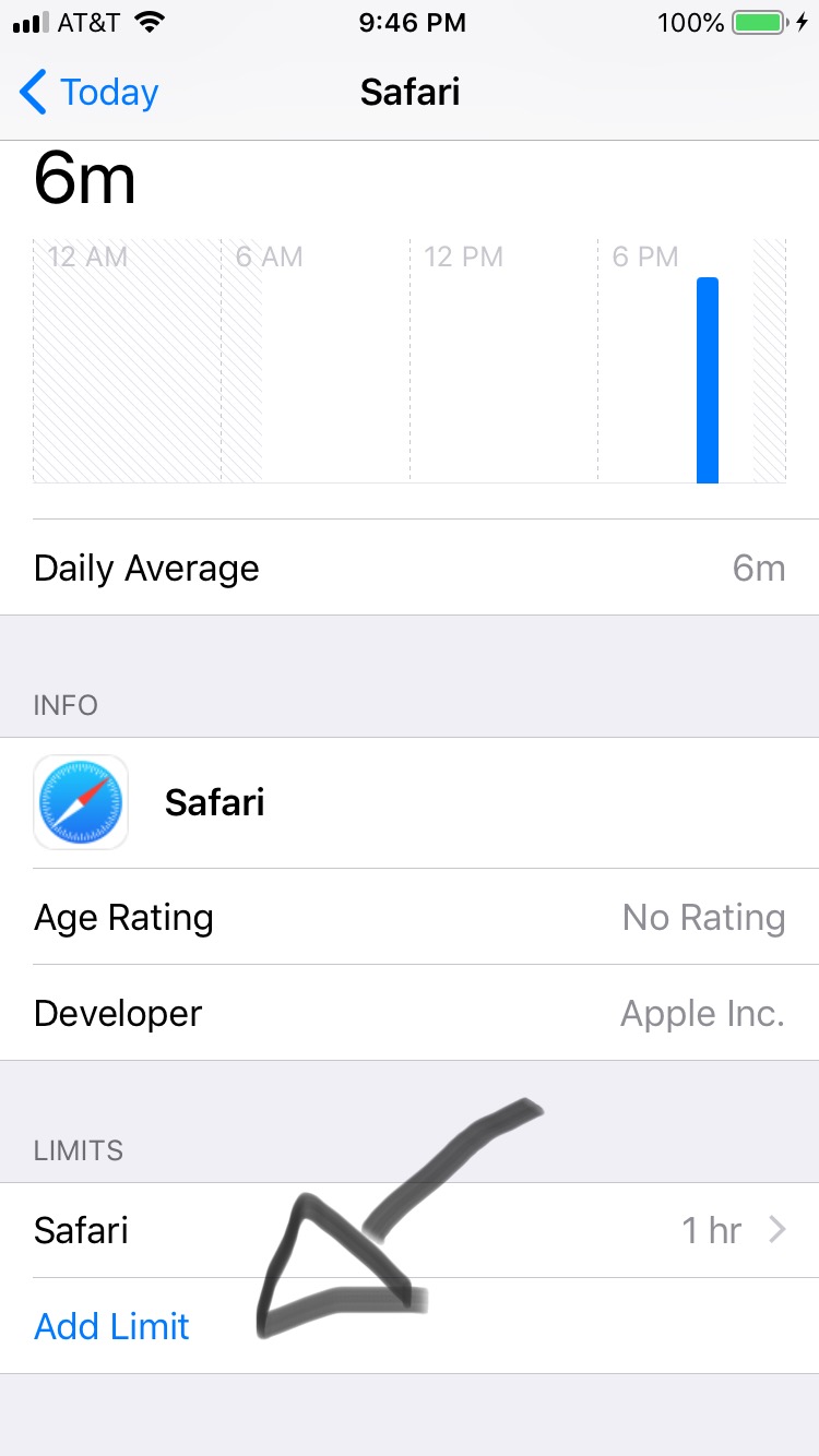 11. Scroll to bottom where it says “Add Limit” and add whatever limit you want to have set while using the Safari App.
