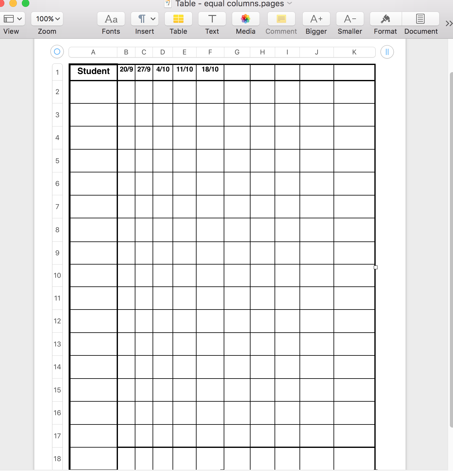 Let's say that you make a wider A column, and you want the remaining columns in the table to equalize. You select the B thru K column headers, and then from the Format menu : Table :Distribute Columns Evenly. Column A remains unchanged, but now columns B → K are equal width.