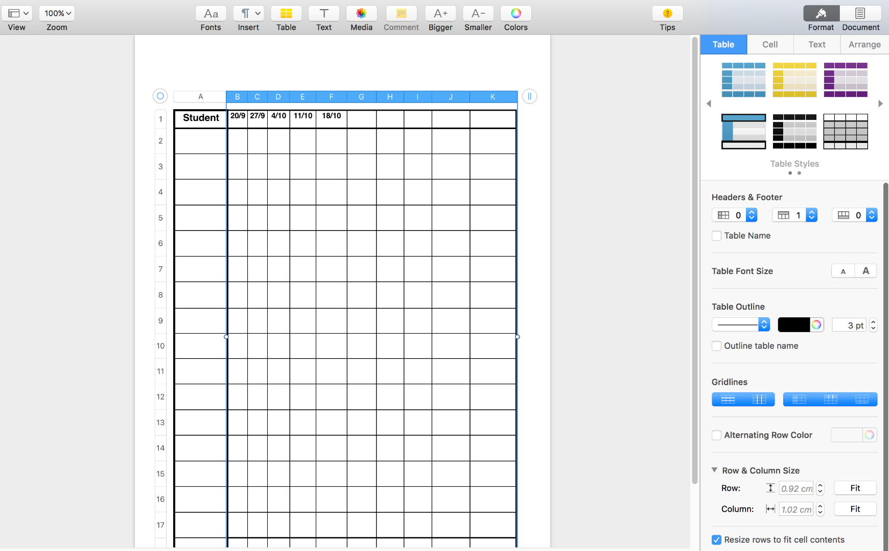 Insert a table. By default, the Column Size is set to Fit, and Resize rows to fit cell contents is selected. Depending on your table goal, you can deselect at Resize rows… checkbox.
