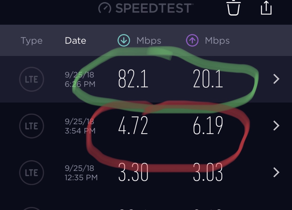 Indoors at my house I agree I get similar speeds on my ipad with iOS 12 as I do with my iPhohne Xs. I get better cell speeds in strong to moderate areas of town (I am in weak cell area however so I used Wifi a lot with all my iphones and in house ok). Outside my house the story is different Wifi used to be weaker but still worked ok, I ran your test just now with my iPad Pro on 12.0 and Xs on 12.0 and here are results in image — major difference!