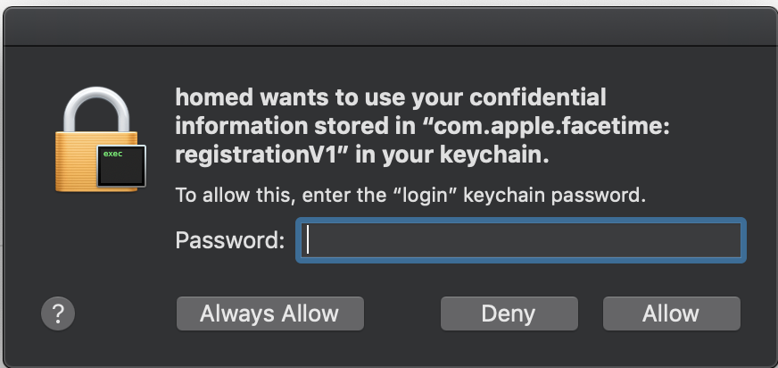 Something called "homed" wants to use my confidential information stored in "com.apple.facetime:registrationV1"